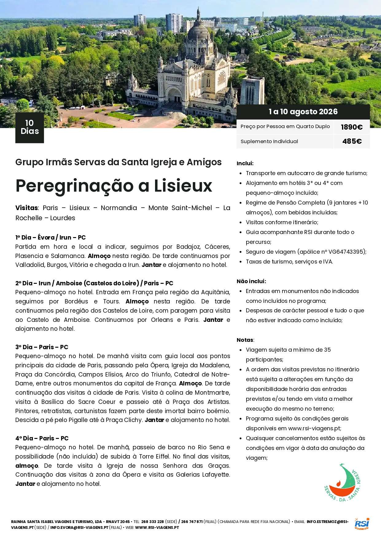 A Congregação das Irmãs Servas da Santa Igreja irá realizar de 1 a 10 de agosto uma Peregrinação a Lisieux, nos passos de D.Manuel Mendes.