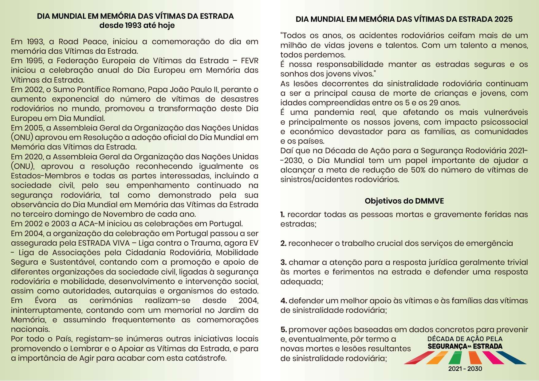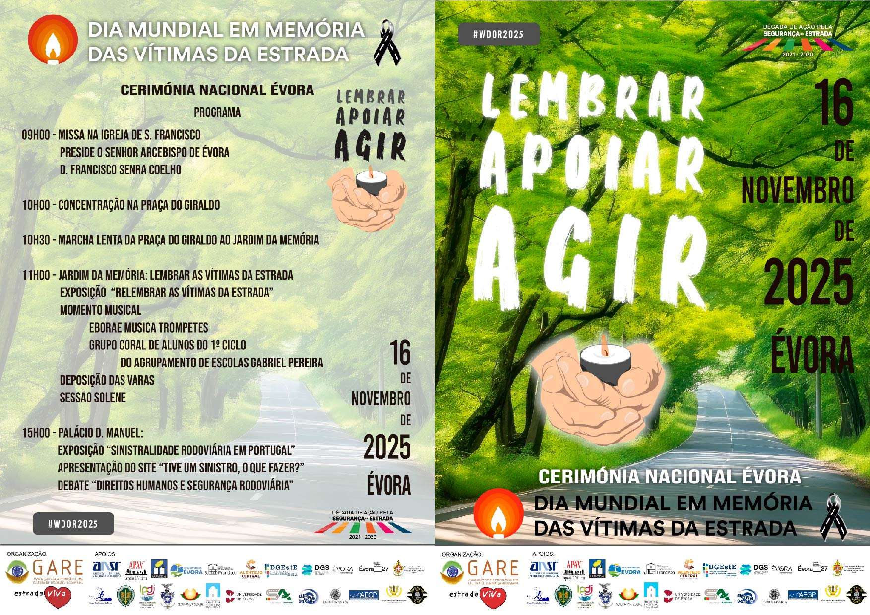 Neste domingo, dia 16 de novembro, Évora volta a receber a Cerimónia Nacional que assinala o Dia Mundial em Memória das Vítimas da Estrada, numa organização da GARE – Associação para a Promoção de uma Cultura de Segurança Rodoviária.