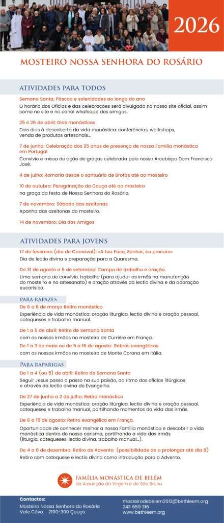 Além deste dia, a Comunidade das Monjas de Belém partilha (imagem ao lado) as principais atividades que irá realizar ao longo do corrente ano de 2026.