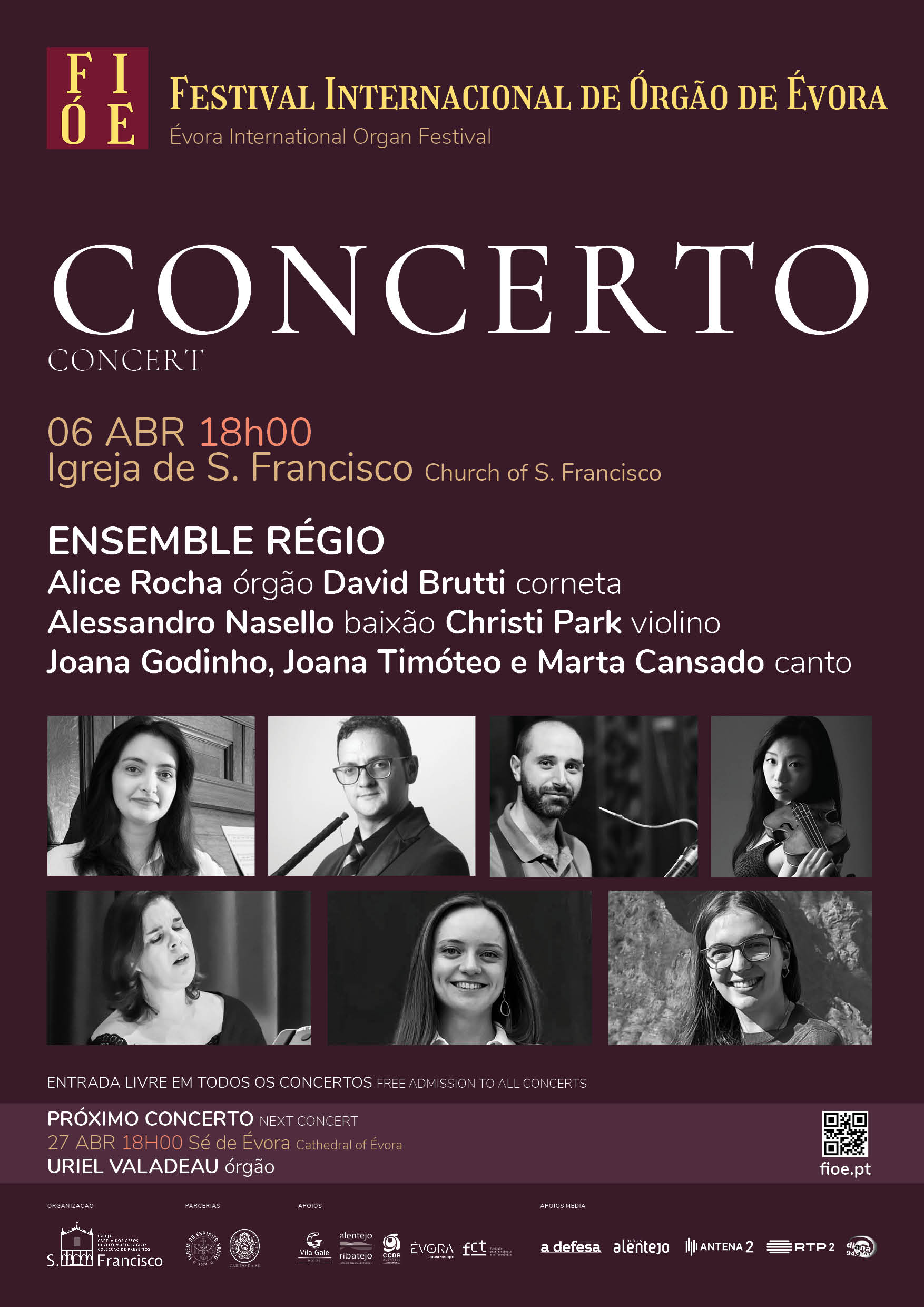 O ENSEMBLE RÉGIO é um agrupamento de formação variável, com músicos nacionais e estrangeiros especializados em instrumentos antigos. Neste concerto apresenta a eborense Alice Rocha, órgão; David Brutti, corneta; Alessandro Nasello, baixão; Christi Park, violino e Joana Godinho, Joana Timóteo e Marta Cansado, canto