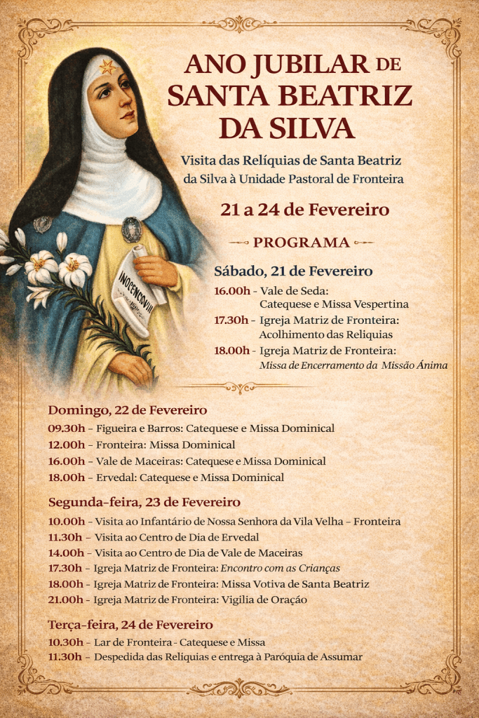 De 21 a 24 de fevereiro, a Unidade Pastoral de Fronteira acolherá a visita das Relíquias, conforme programa no cartaz: