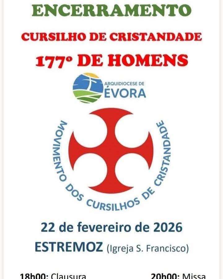 No domingo, dia 22 de fevereiro, a partir das 18h00, decorrerá o Encerramento do Cursilho de Cristandade 177º de Homens da Arquidiocese de Évora.