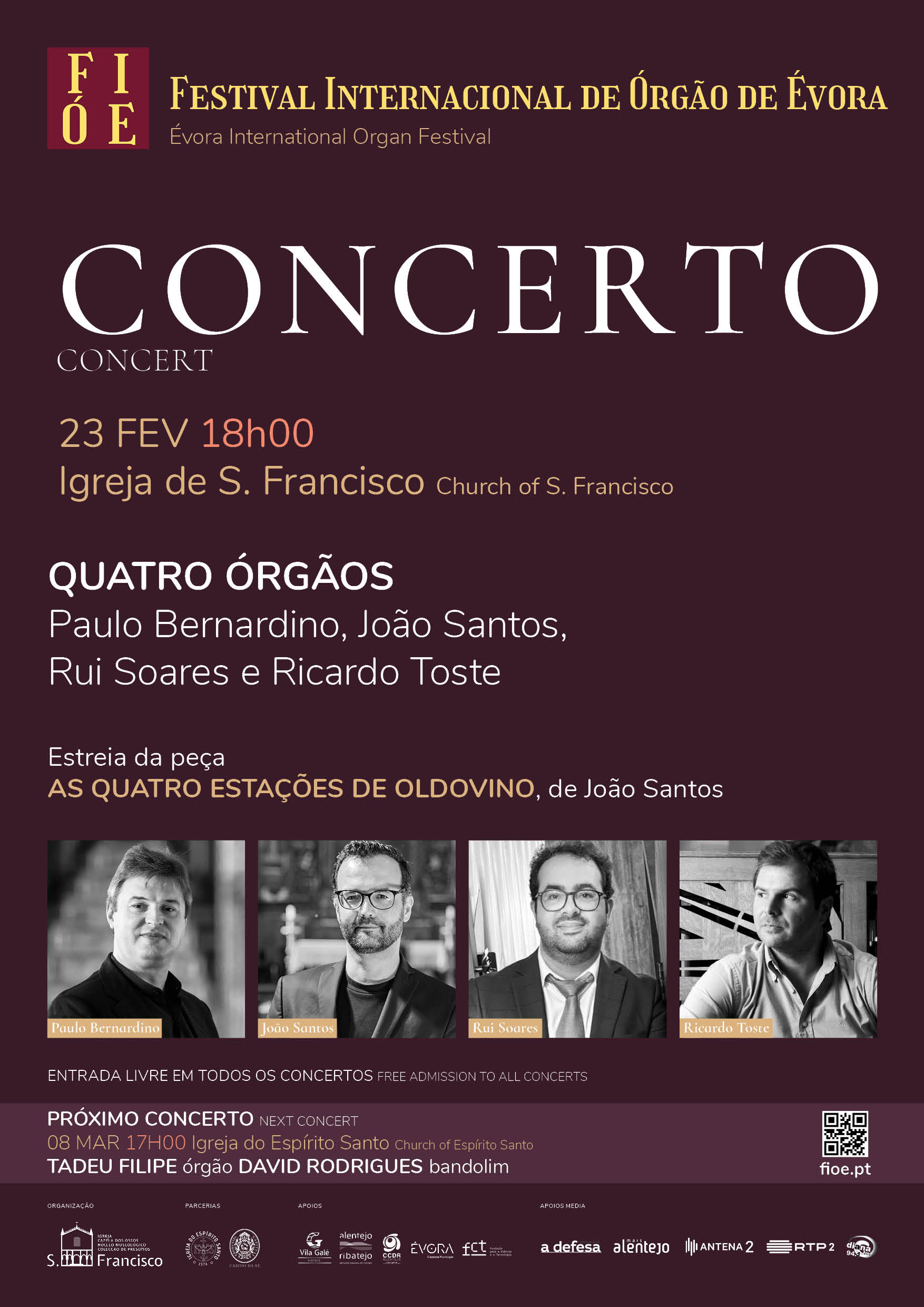 O FIOE- Festival Internacional de Órgão de Évora apresenta o sexto concerto do Ciclo 2024-2025. Será neste dia 23 de fevereiro às 18h00, na igreja de S. Francisco.