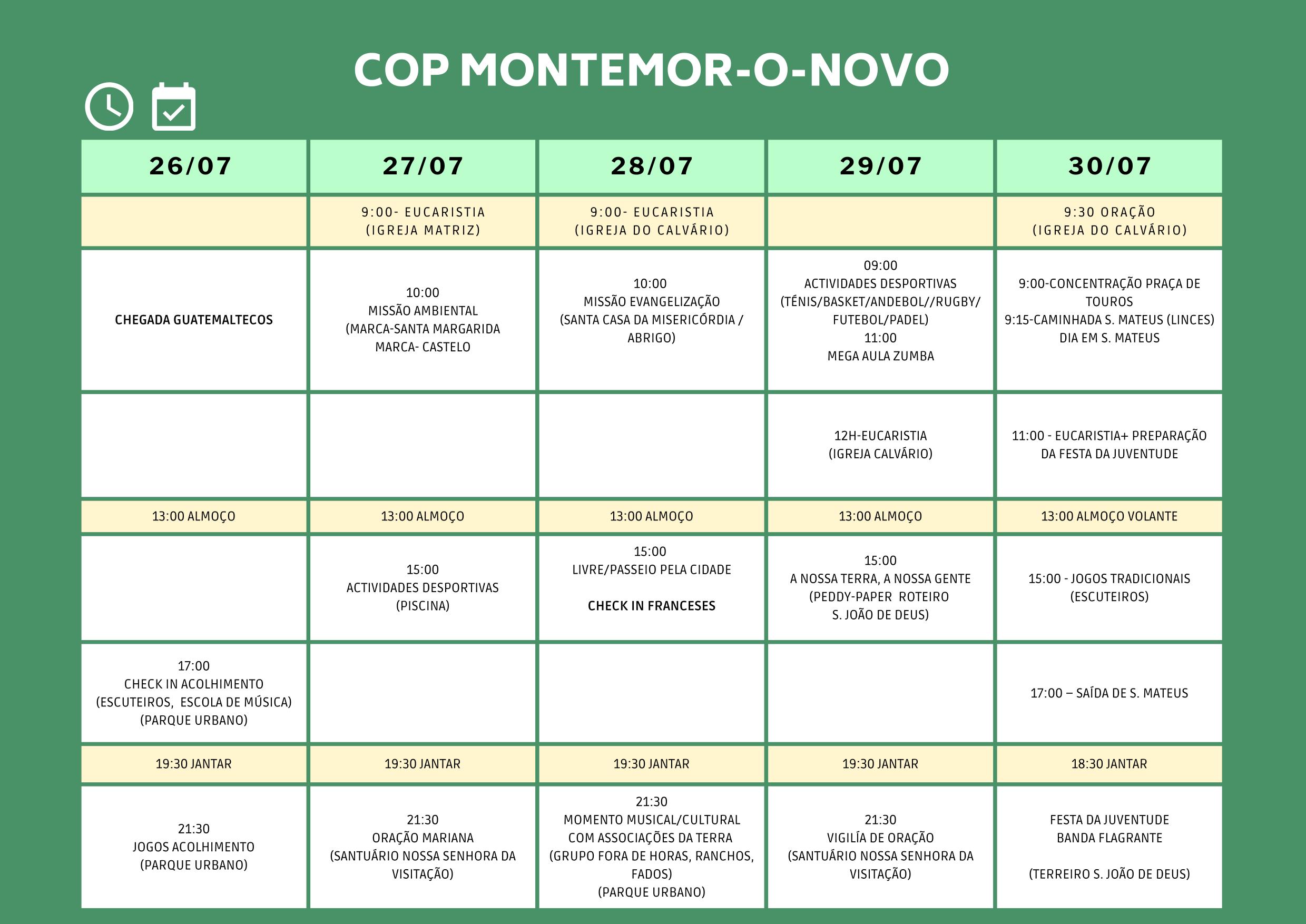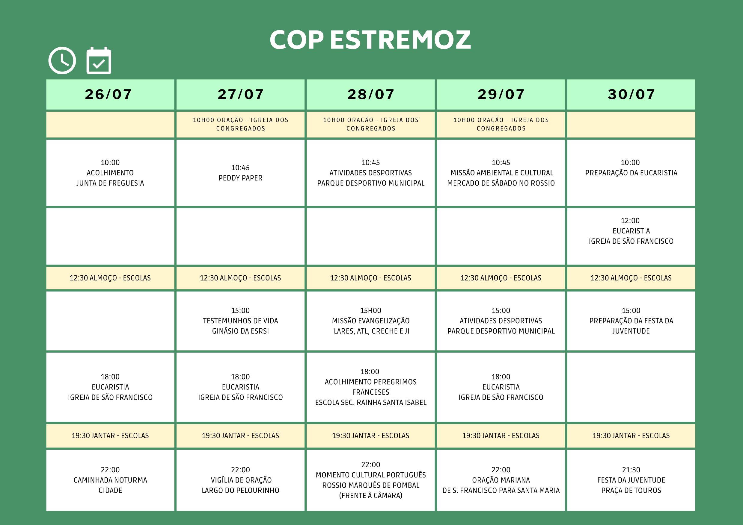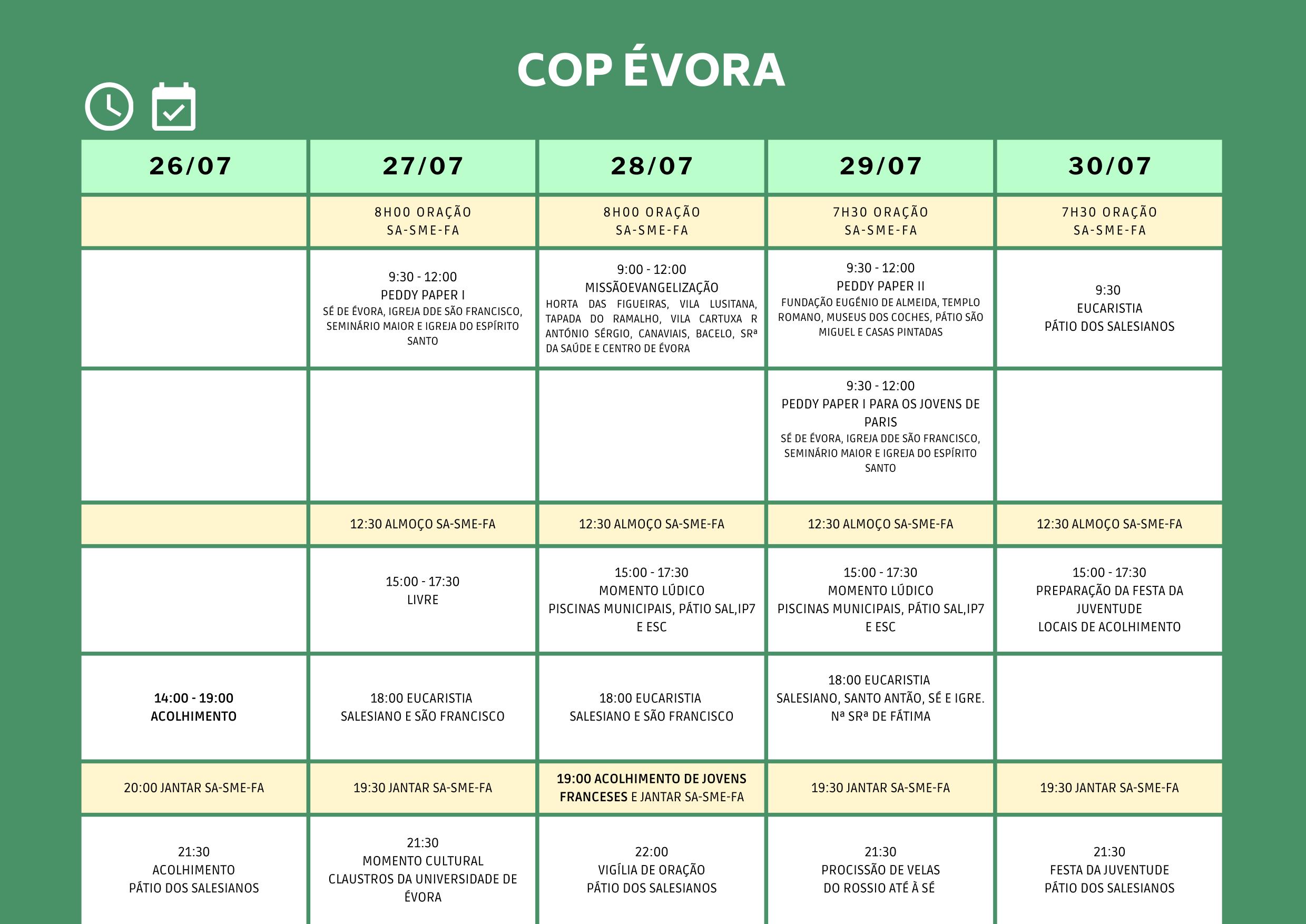 Fique aqui a conhecer todos os programas de todos os COP’s da Arquidiocese de Évora que irão acolher jovens peregrinos estrangeiros nas suas paróquias.