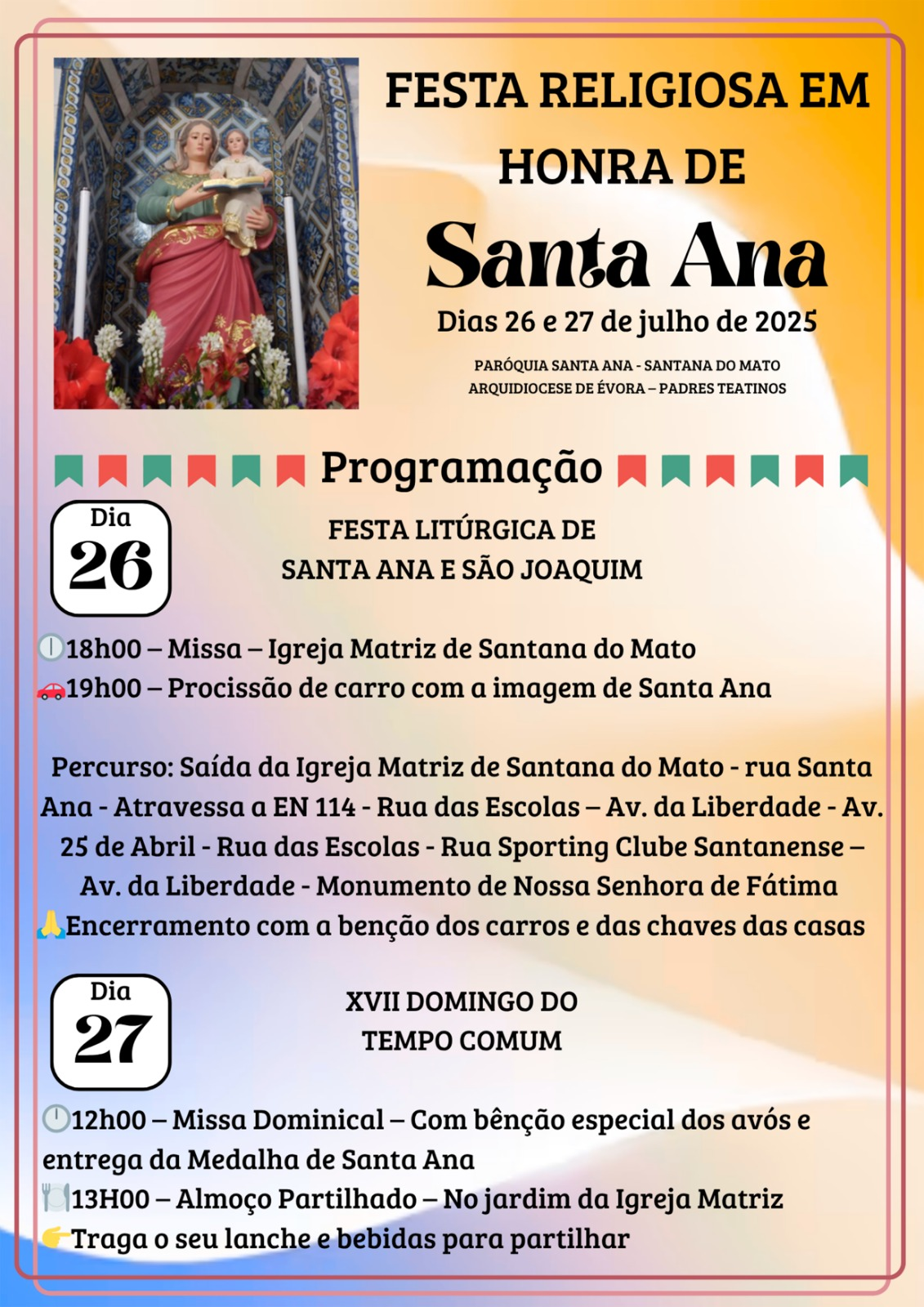 26 e 27 de Julho: Paróquia de Santa Ana realiza festa religiosa em honra da PadroeiraBy Pedro Conceição / 25 de Julho, 2025 Nos dias 26 e 27 de Junho, a Paróquia de Santa Ana, na localidade de Santana do Mato, realizará festa religiosa em honra da Padroeira.