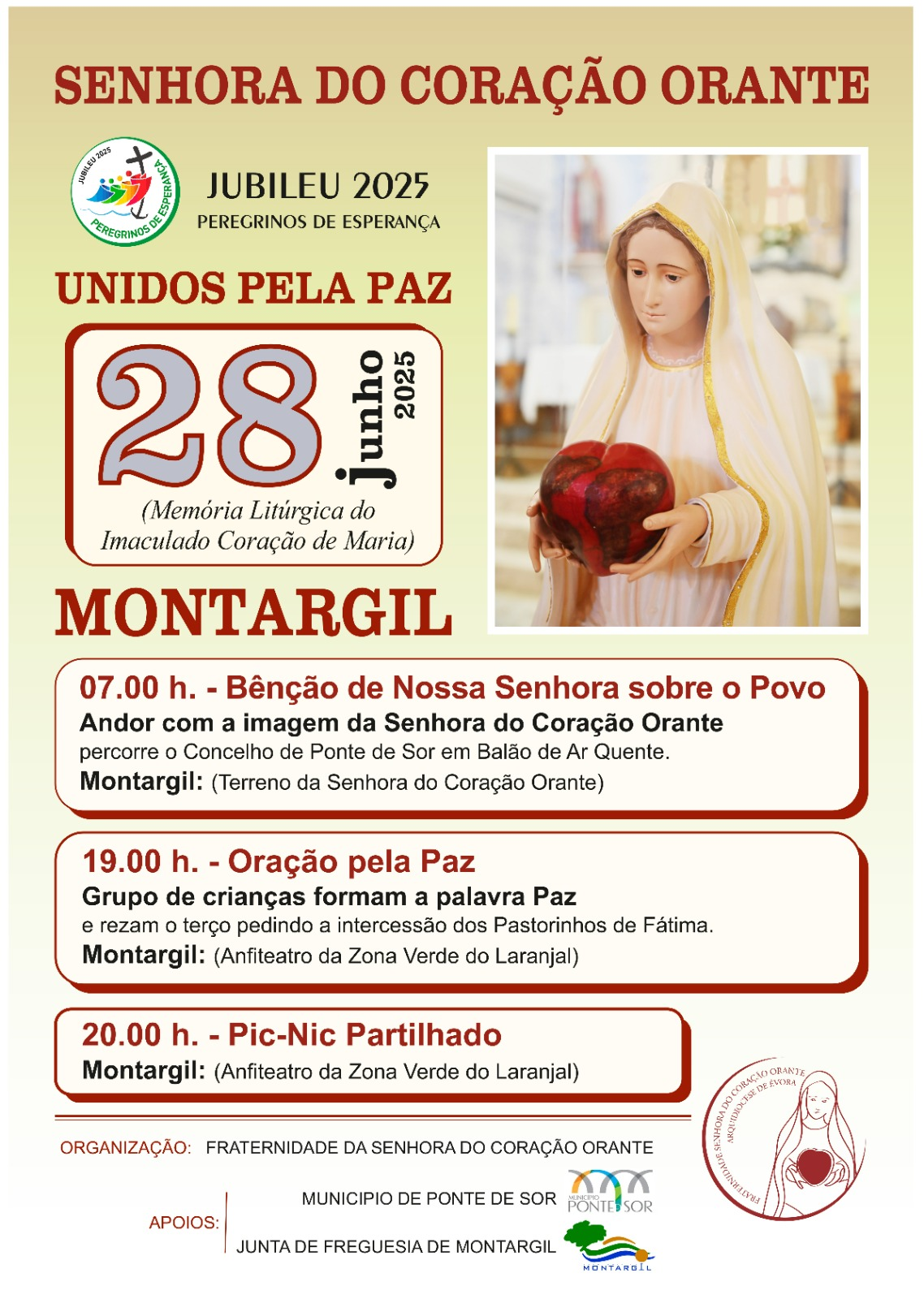 Neste sábado, 28 de junho, em Montargil, realizou-se a iniciativa “Unidos pela Paz”, organizada pela Fraternidade da Senhora do Coração Orante.