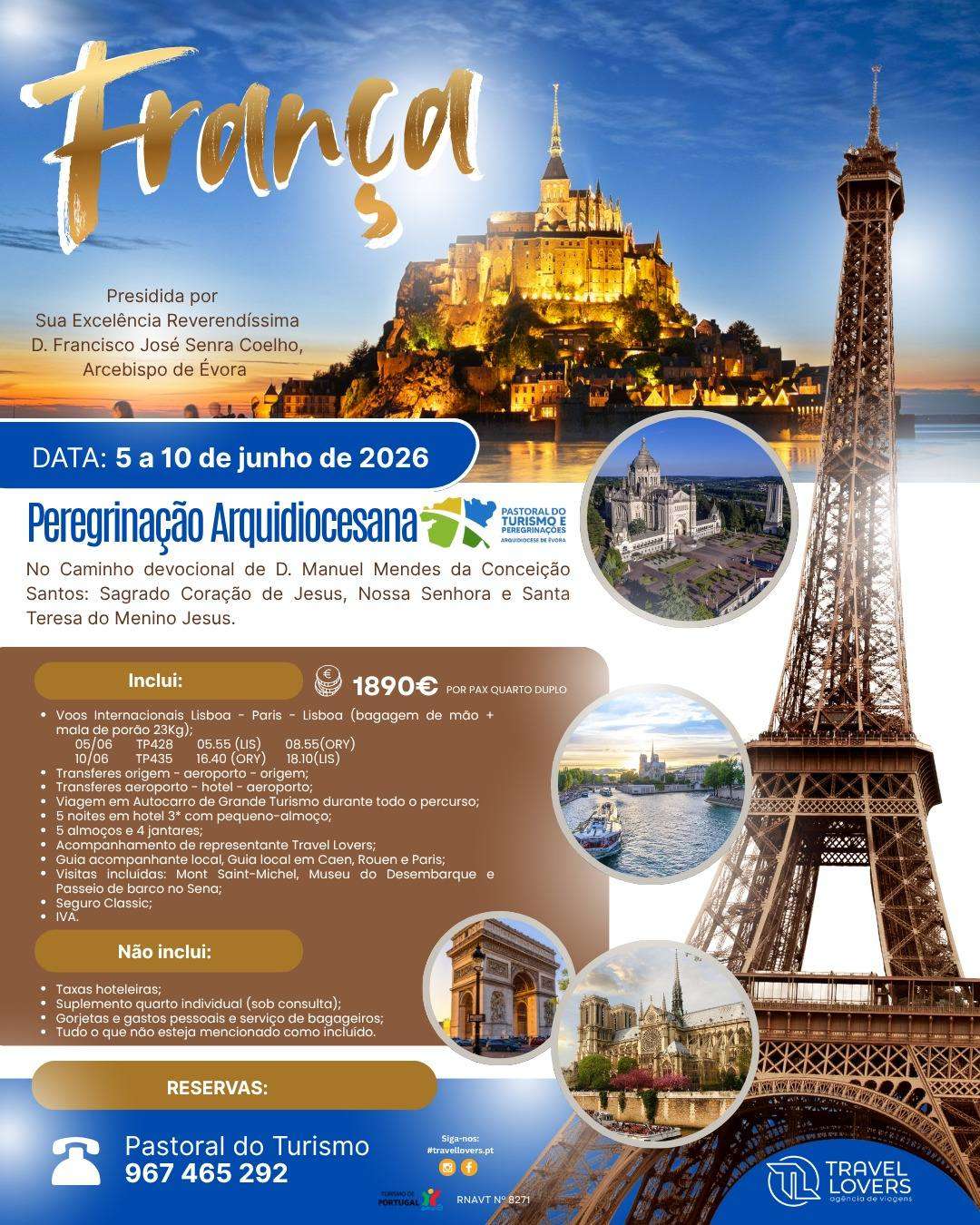 A Pastoral do Turismo e das Peregrinações vai realizar de 5 a 10 de junho de 2026, uma Peregrinação Arquidiocesana a França no caminho devocional de D. Manuel Mendes da Conceição Santos: Sagrado Coração de Jesus, Nossa Senhora e Santa Teresa do Menino Jesus.