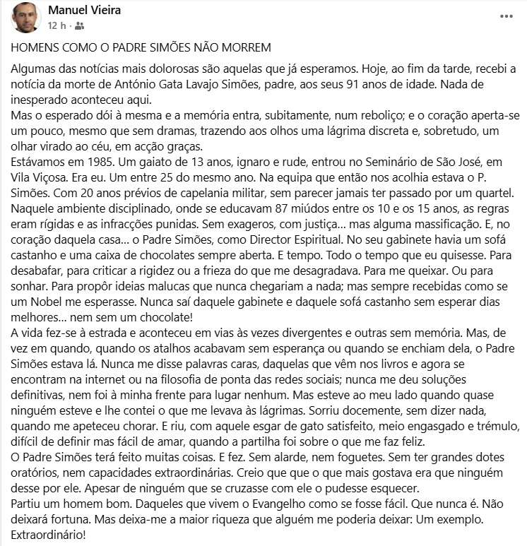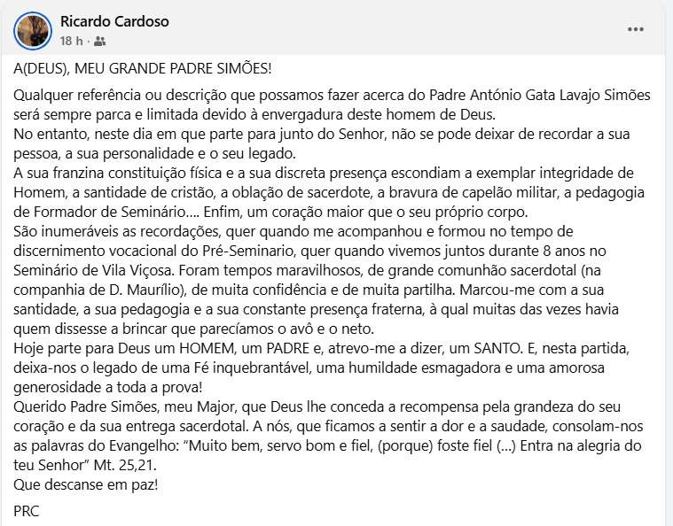 Arquidiocesanos de Évora fazem memória e homenagem ao Cónego António SimõesBy Pedro Conceição / 17 de Outubro, 2025 Após ser conhecida a notícia da partida do Cónego António Simões, as redes sociais inundaram-se de sentidas palavras de homenagem e gratidão pela vida e ministério do Cón. António Simões. Partilhamos aqui alguns post’s que tivemos conhecimento: