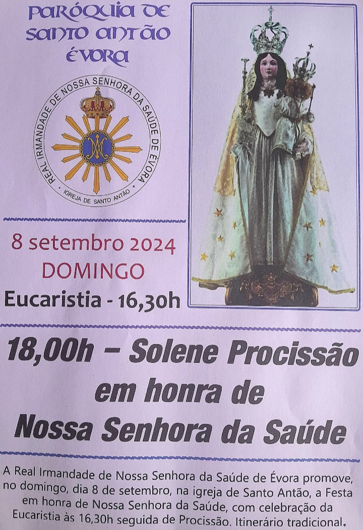 A Real Irmandade de Nossa Senhora da Saúde de Évora comunica que, segundo programa abaixo, decorrerá no próximo dia 8 de Setembro a Missa Solene e a solene procissão em honra de Nossa Senhora da Saúde de Évora, sua Augusta Padroeira, que serão presididas pelo Arcebispo de Évora.