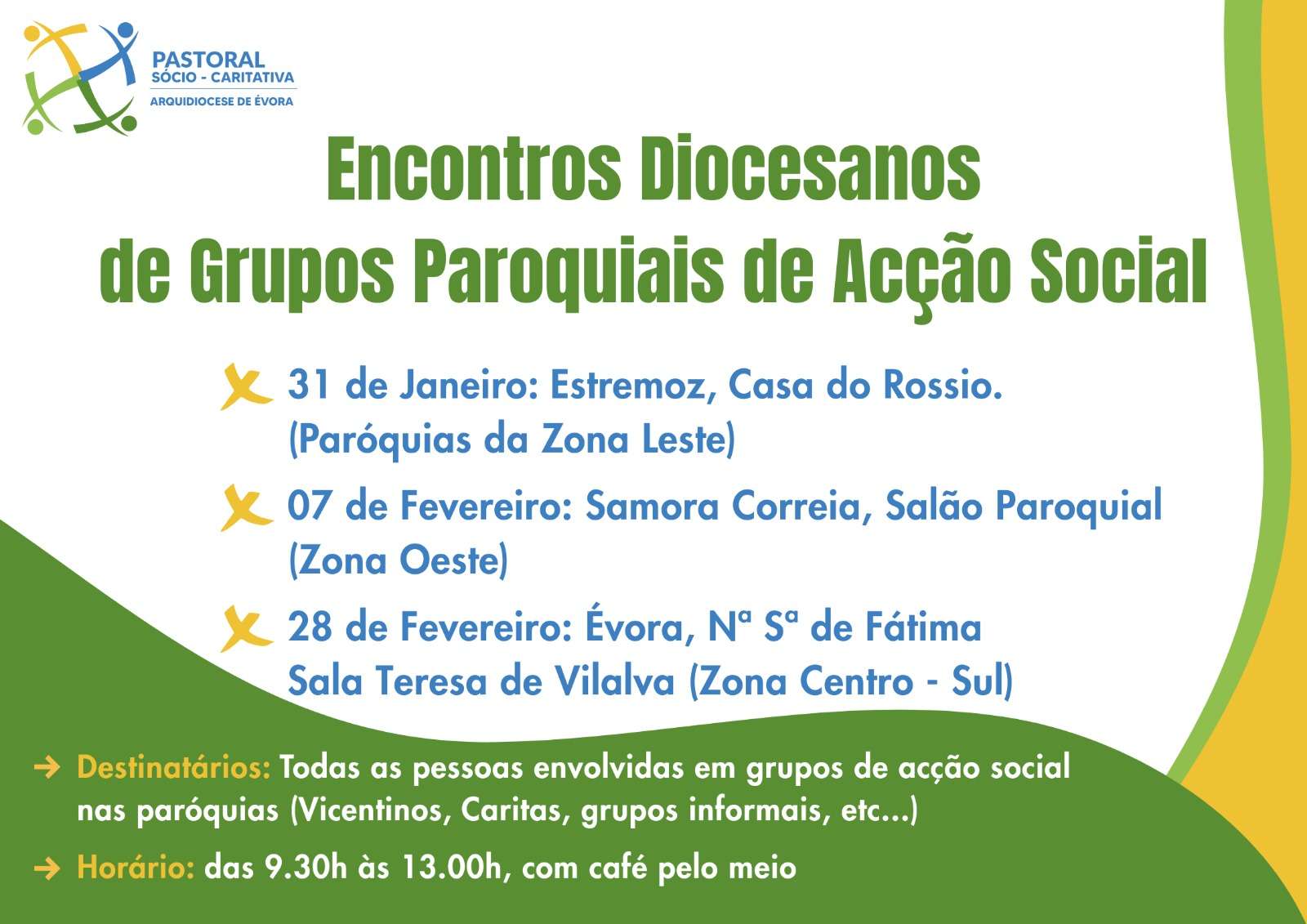 O Departamento de Pastoral Social da Arquidiocese de Évora vai realizar, em janeiro e fevereiro, um conjunto de Encontros de Grupos Paroquiais de Acção Social, nas três Zonas pastorais.