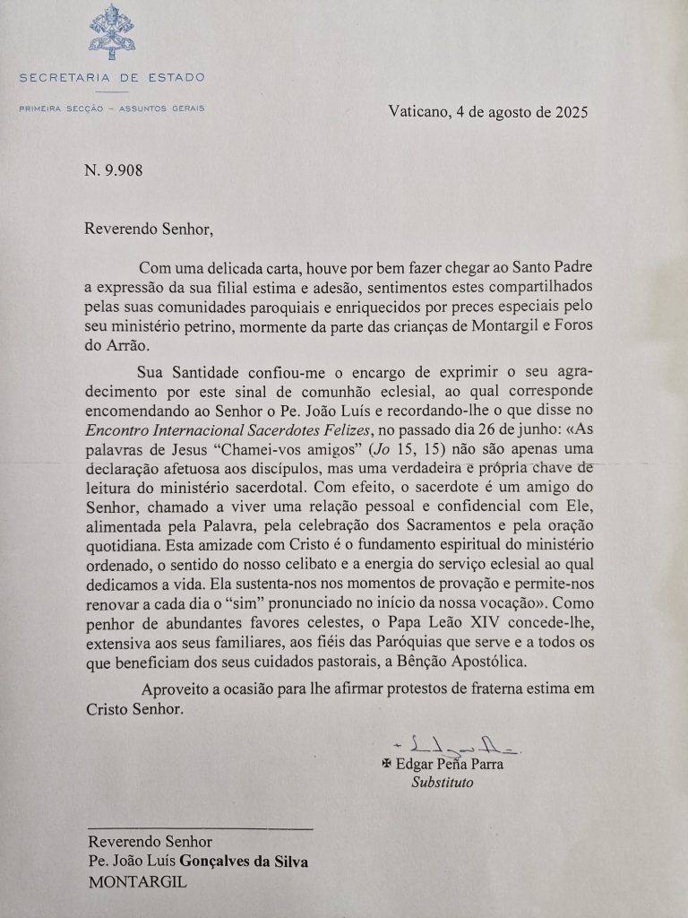 No passado dia 28 de Junho, memória litúrgica do Imaculado Coração de Maria, a Fraternidade da Senhora do Coração Orante em Montargil organizou um momento de oração pela Paz no mundo. Três grupos de 25 crianças da catequese paroquial recitaram o terço e formaram a palavra Paz, pedindo a intercessão dos Pastorinhos de Fátima. Foram ainda colocadas nas mãos da Senhora do Coração Orante as várias orações escritas pelos grupos de catequese. Estas mesmas orações foram enviadas ao Papa Leão XIV que agradeceu através da Secretaria de Estado do Vaticano como se pode ler no comunicado: